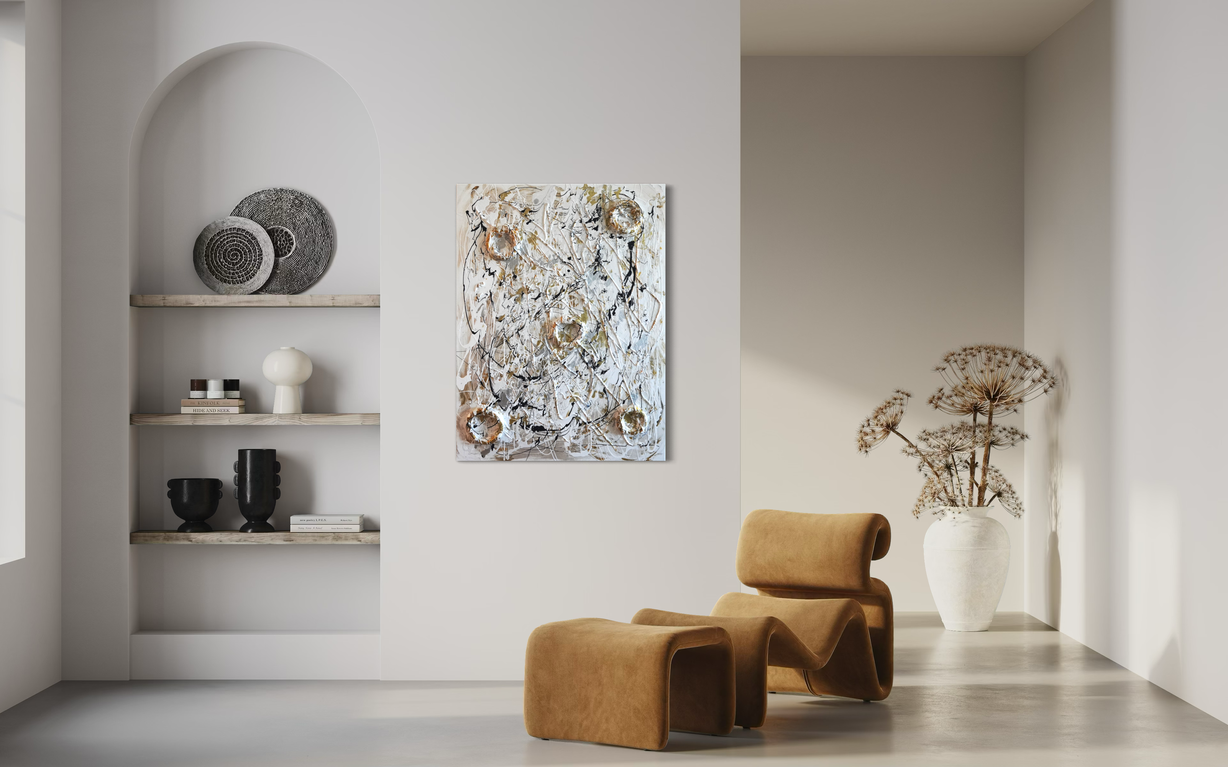 The "Sanctuary" collection invites a sense of peace through the luminous use of gold. Gold is integral, infusing each piece with a sacred, serene quality, creating an inviting atmosphere, transforming each canvas into a sanctuary for the soul.