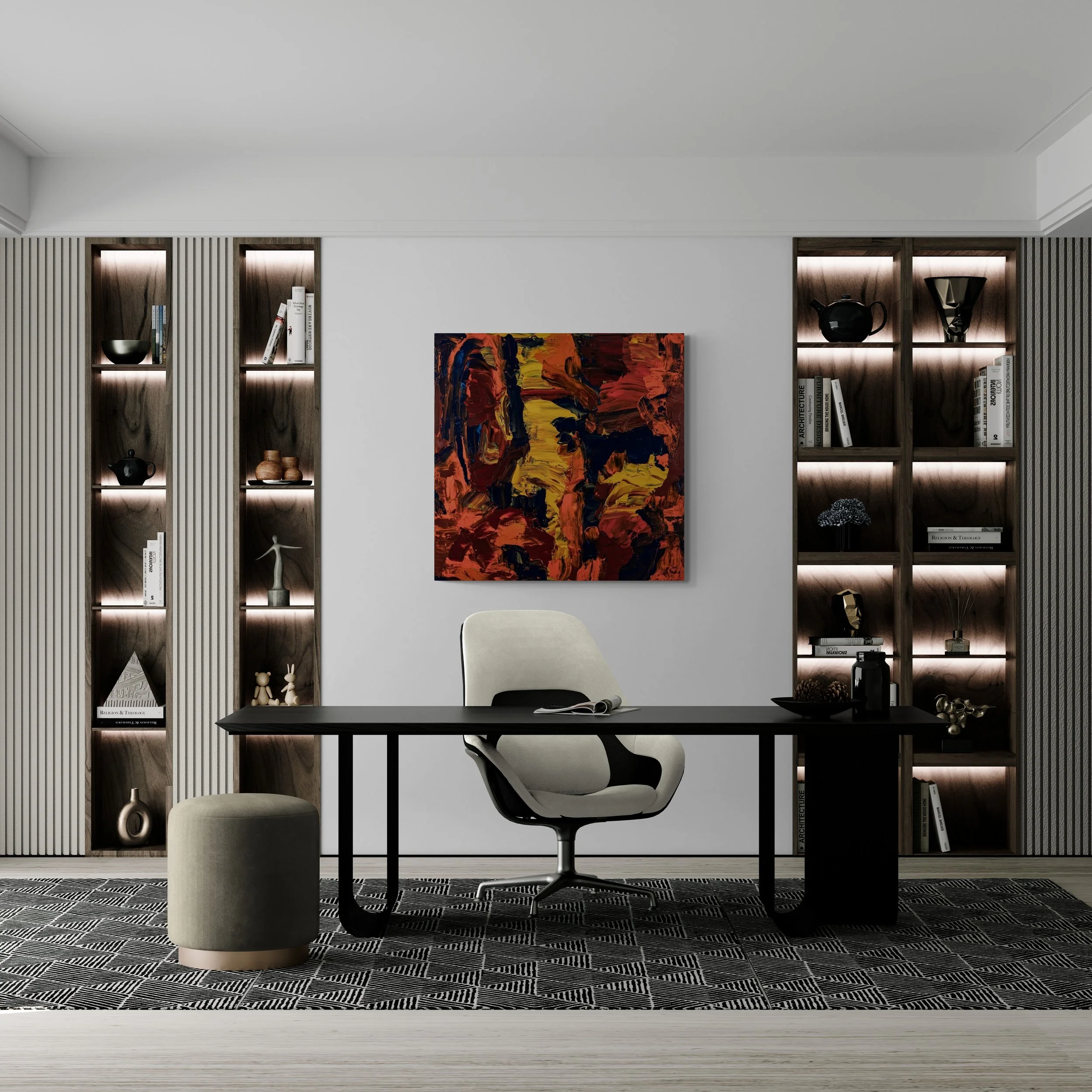 Acrylic paints on stretched canvas, using palette knives.